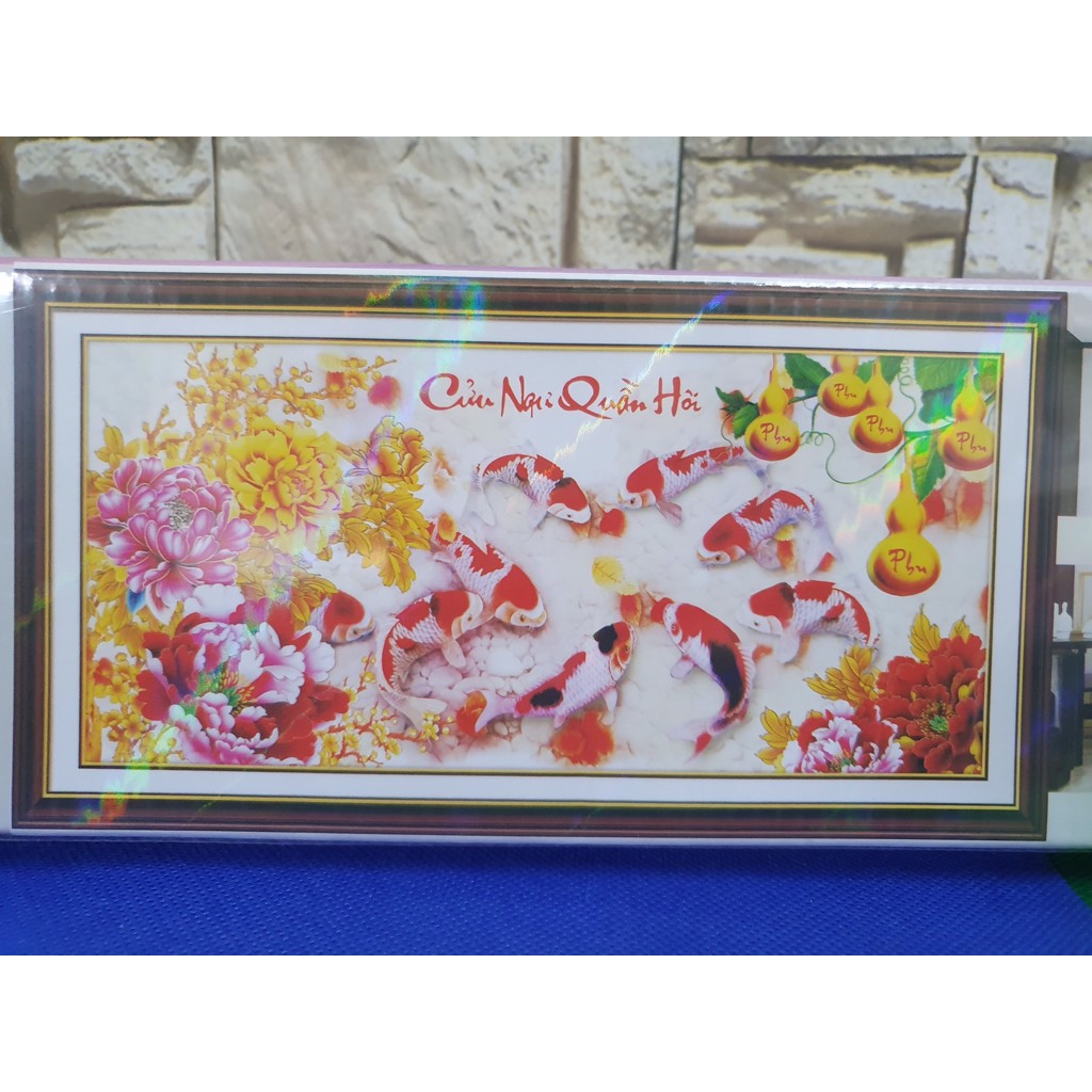Tranh đính đá kt 128x65 cm /thêu chữ thập cửu ngư quần hội kt 99x52cm