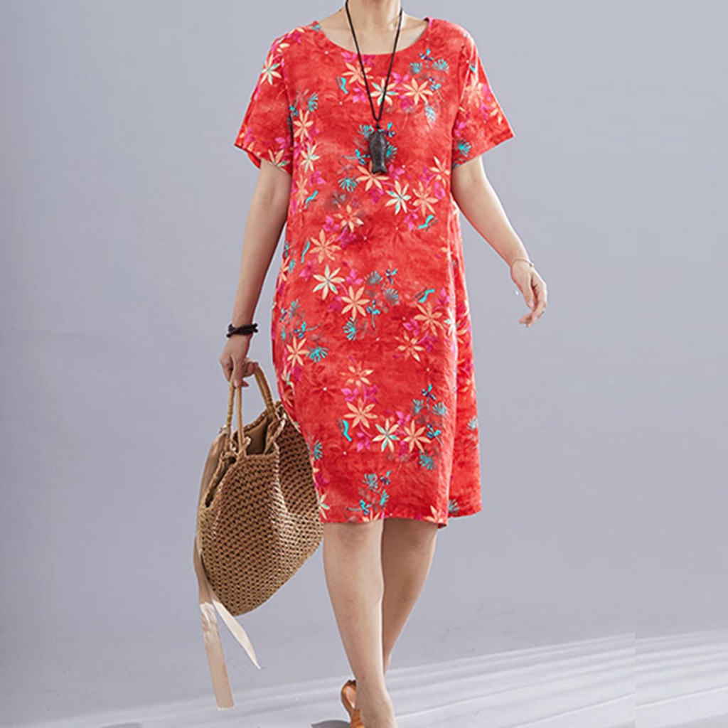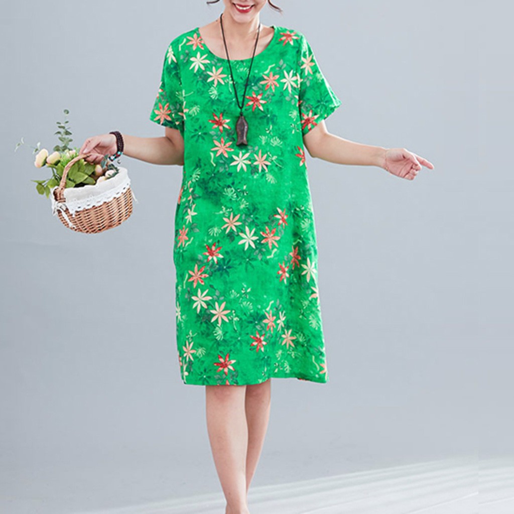 Đầm Dài Qua Gối Tay Ngắn Cổ Tròn In Họa Tiết Cổ Điển Thời Trang Cho Nữ