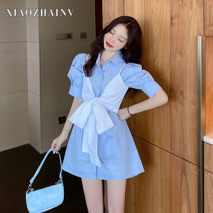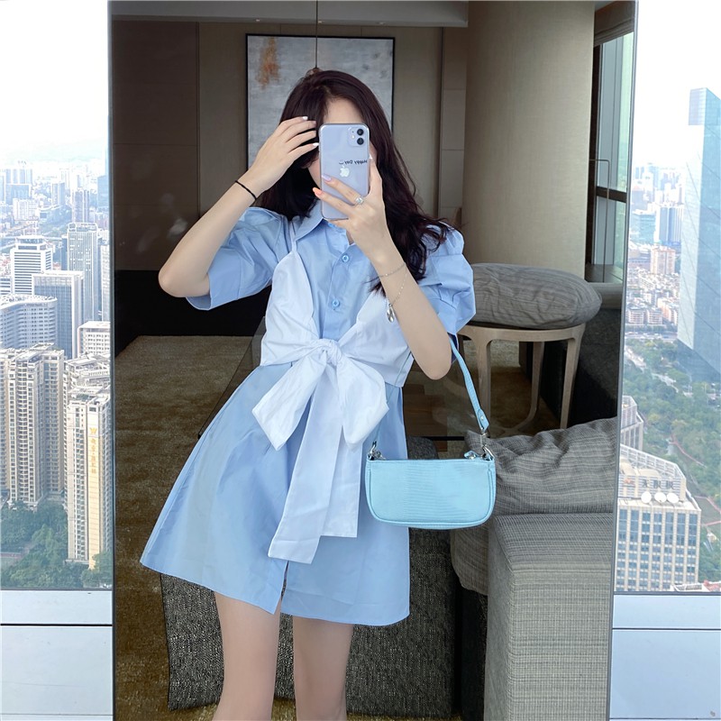 [ Mã 11FASHIONSALE1 giảm 10K đơn 50K ] Xiaozhainv Đầm ngắn tay dáng rộng phối nơ sành điệu dành cho nữ