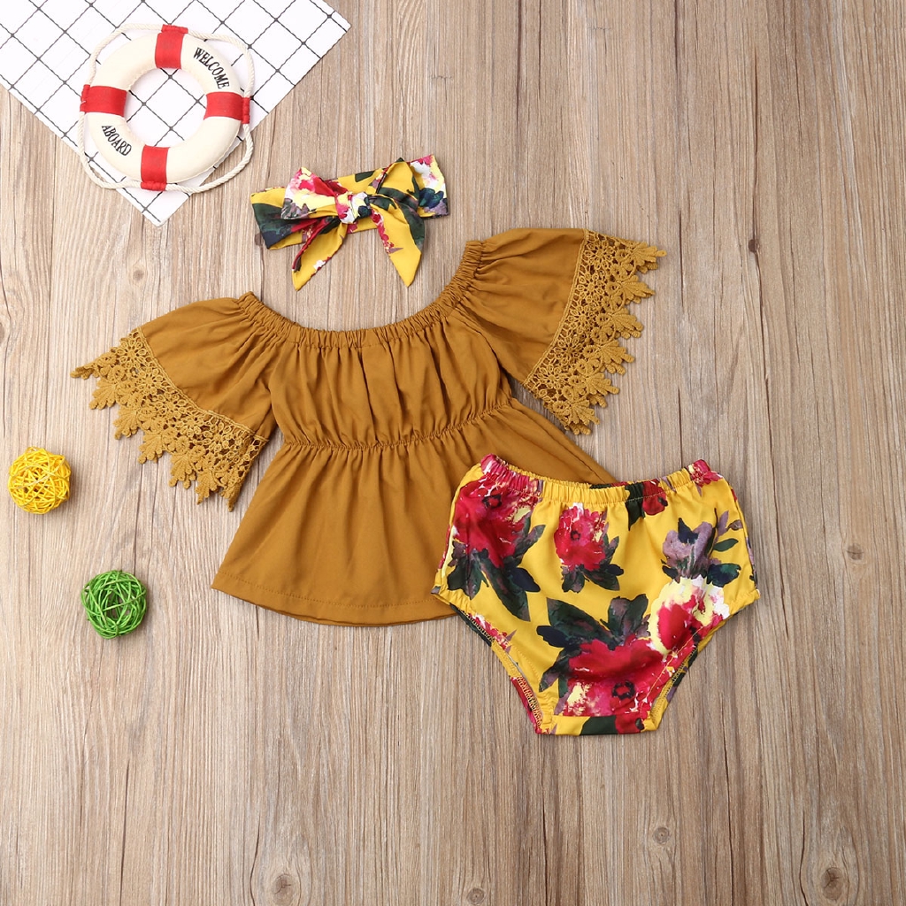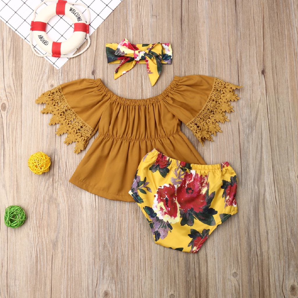 Set đồ 3 món gồm áo phối ren quần họa tiết hoa phong cách mùa cho bé gái