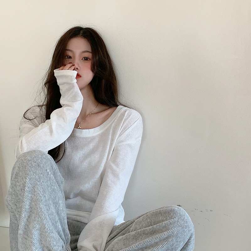 Áo Thun Tay Dài Cổ Tròn Màu Trơn Đơn Giản Thời Trang