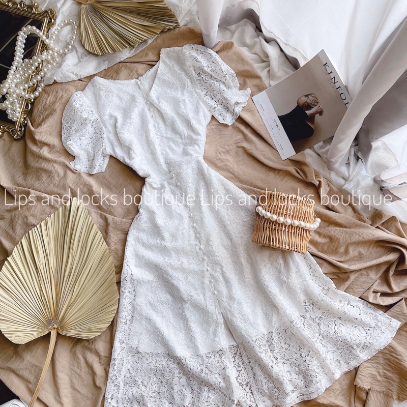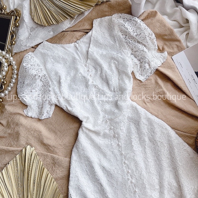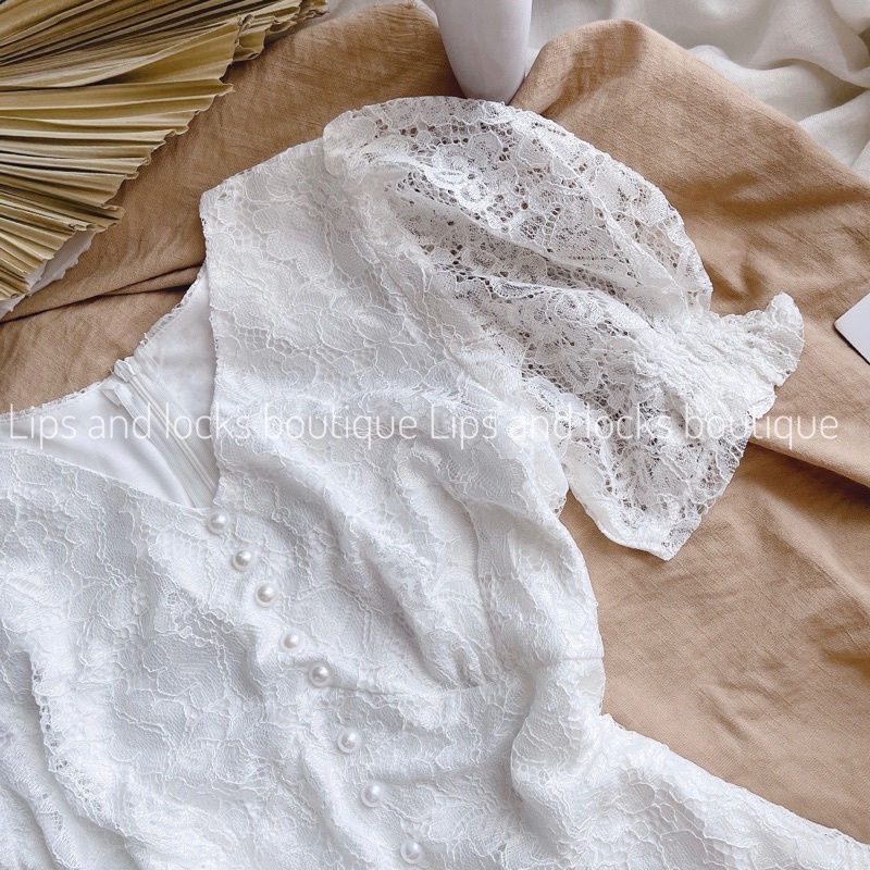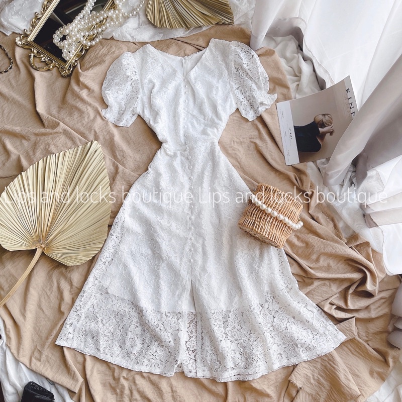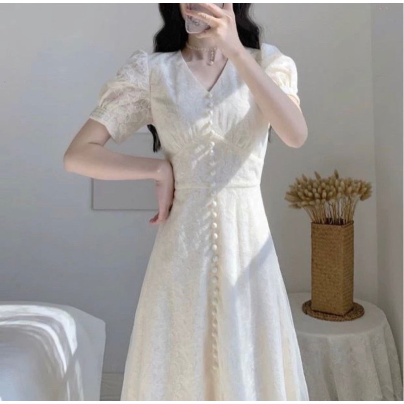 ĐẦM MIDI TRẮNG REN HOA PHỐI NÚT NGỌC ✨ - KÈM VIDEO HÌNH THẬT